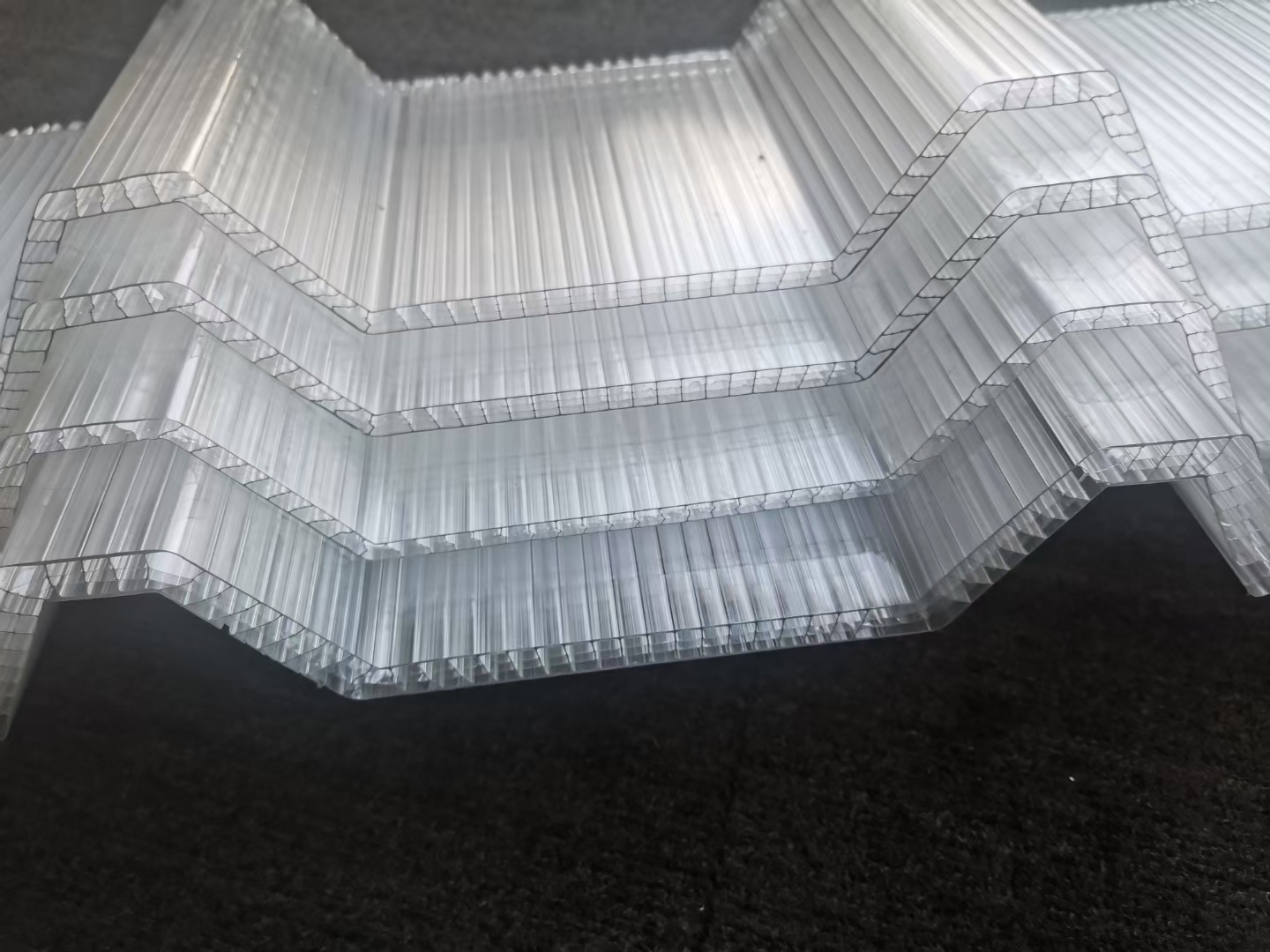 多层中空瓦隔热保温效果佳,抗雪载和冰雹冲击更好,5个间距流水效果更好,厚度从6mm到16mm任意,采光率达90%以上,自身重量轻降低建筑成本,多层设计抗老化可达20年,最上层达0.8mm,涂层uv达50微米以上